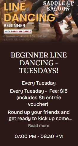 The Saddle Up Saloon is offering a beginner’s line dancing class on Tuesday, June 9th. The cost is $15/person and they’ll give you a $5 voucher towards dinner.